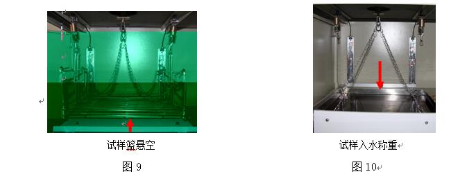 ⑵ 推動上活動托板,讓車轍試件置于電子天平正下方,將方形網籃上的2個帶不銹鋼鏈子的S形掛鉤掛在電子天平下方的保險掛鉤上,見圖8。