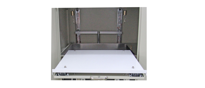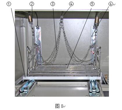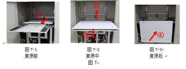 試驗完成后,一般可把活動托板處于打開待工作狀態,如果儀器長期不用而需要關閉前門,需要將活動托板復原到初始位置,方法如下。