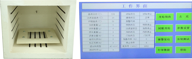 ⑹ 裝好混合料后,如果此時“過濾室溫度”顯示大于600度時,將料筐放在燃燒爐內(nèi)的托盤上,一定要將料筐放置在托盤的中央,才能確保試驗結(jié)果的準確性。