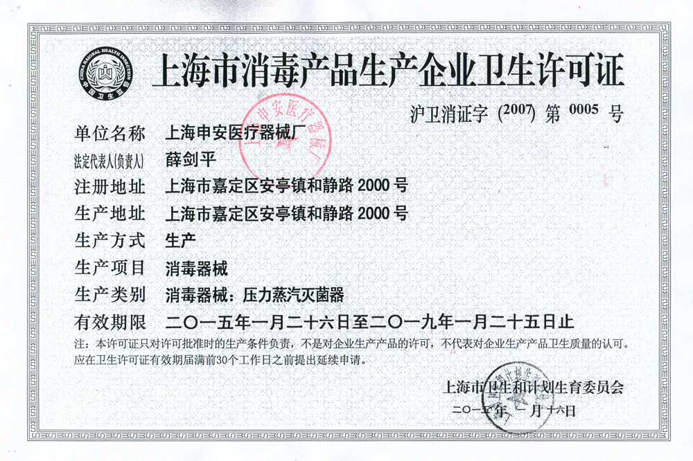 - 上海市消毒產(chǎn)品生產(chǎn)企業(yè)衛(wèi)生許可證【滬衛(wèi)消證字(2007)第0005號(hào)】