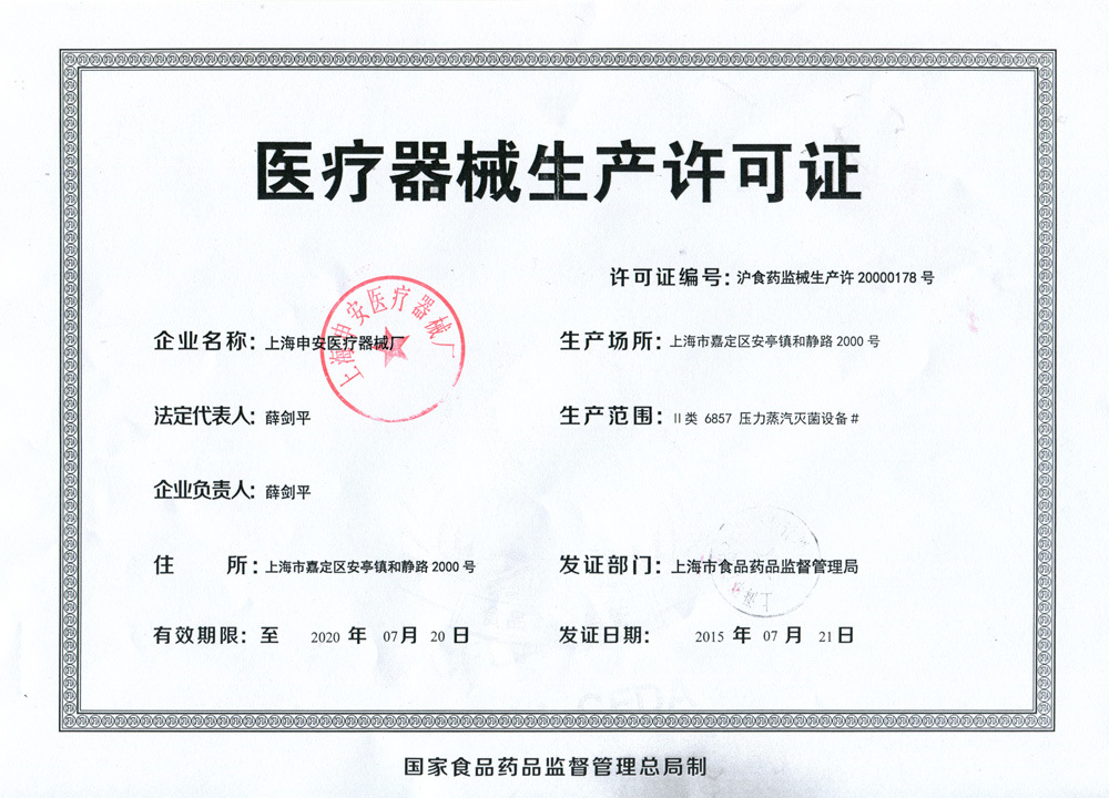 - 醫(yī)療器械生產(chǎn)許可證【滬食藥監(jiān)械生產(chǎn)許20000178號(hào)】