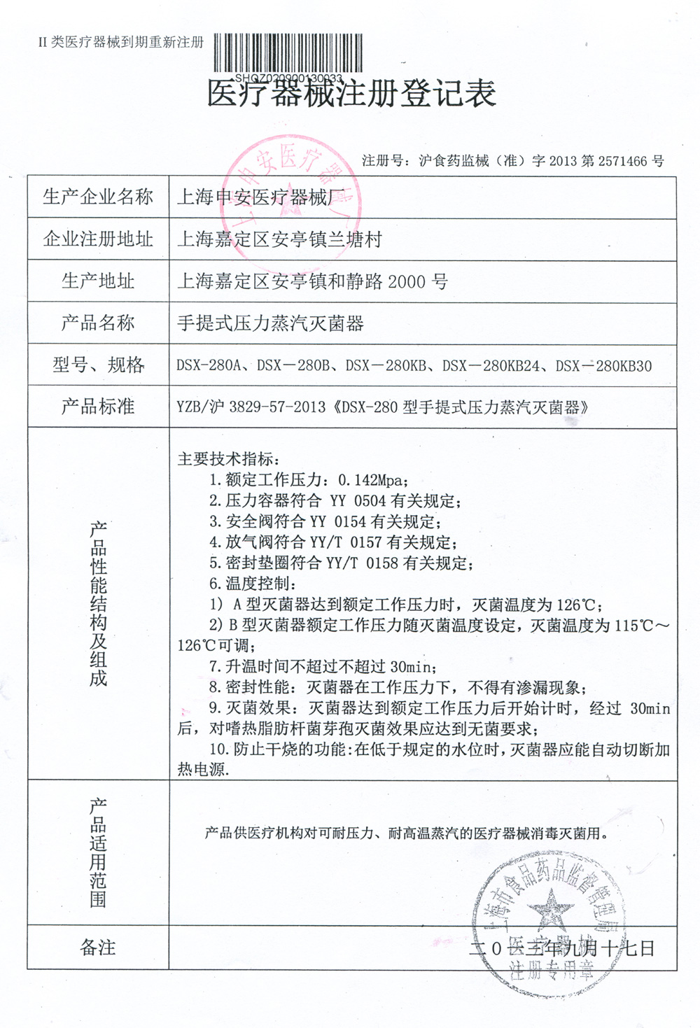 本品符合國家對壓力容器設計與制作的相關規定,并取得了食藥監產品注冊證和消毒產品衛生許可證,是我廠研制開發的新一代手提式滅菌器,其結構先進可靠,具有快捷簡便的操作方式和功能齊全的控制系統,在安全控制上;設置了鍋內有壓力自動鎖蓋及誤操作合蓋不升壓的裝置。本產品采用優質不銹鋼材料精制而成,滅菌指標達到國家醫用手術級標準,是各醫療衛生、大專院校、食品化工、生物科研等單位對器械、敷料、藥液、食品器皿、培養基等物品進行消毒滅菌的理想產品。